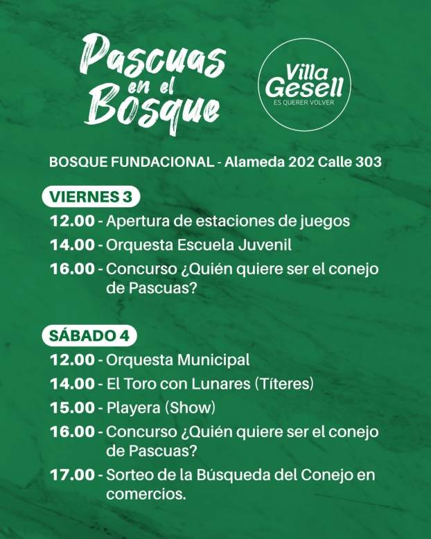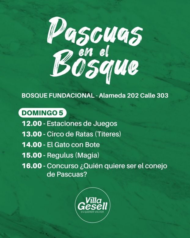 Villa Gesell celebra este viernes, sábado y domingo la sexta edición de “Pascuas en el Bosque”, una propuesta que invita a disfrutar en familia de diversas actividades culturales, gastronómicas y artesanales al aire libre. El evento se desarrollará del viernes 3 al domingo 5 en el Bosque Fundacional, ubicado en Alameda 202 y calle 303.
